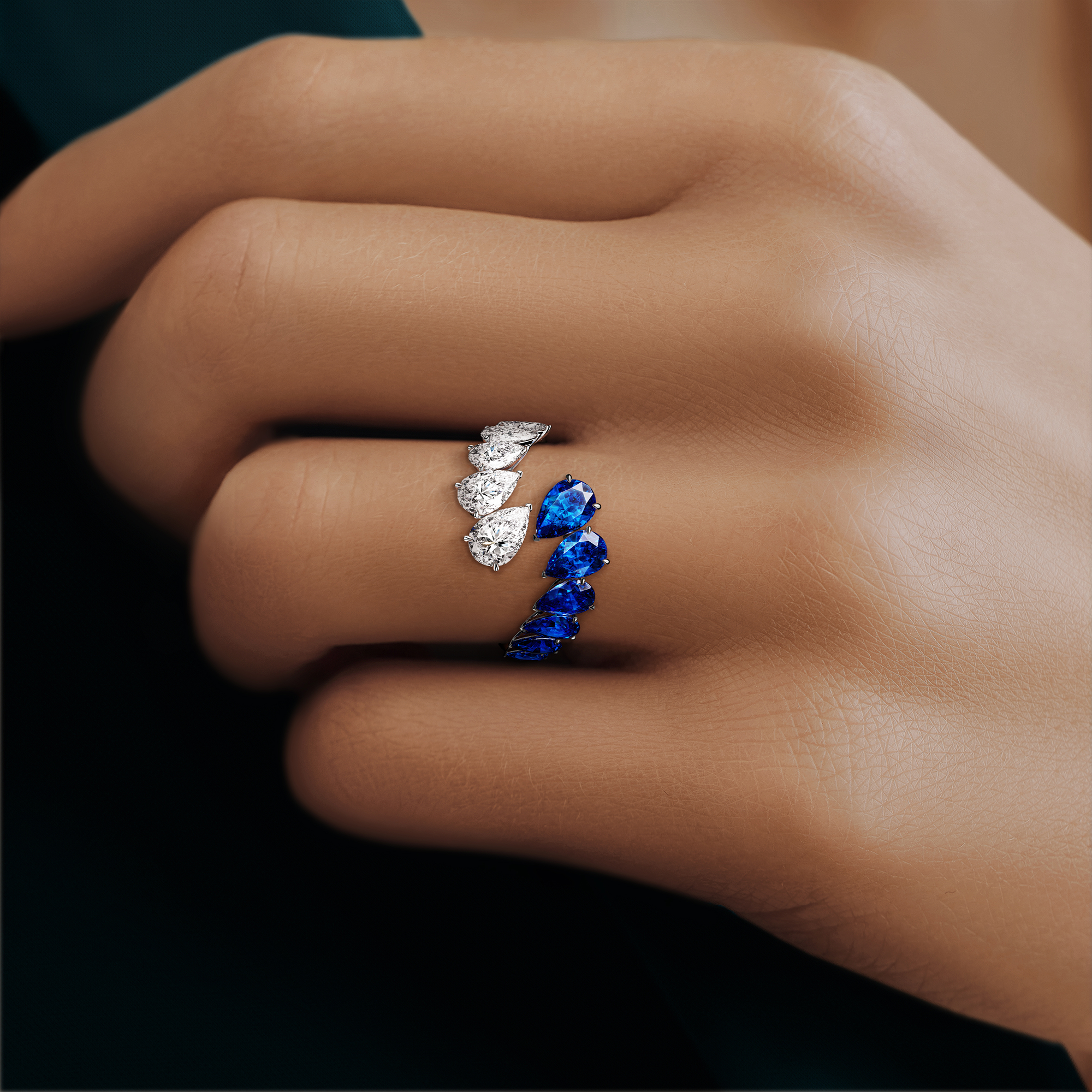 This mesmerizing ring intertwines deep sapphire hues with moissanite’s radiant gleam, crafting a swirling masterpiece that exudes luxury and whispers tales of enduring passion.
